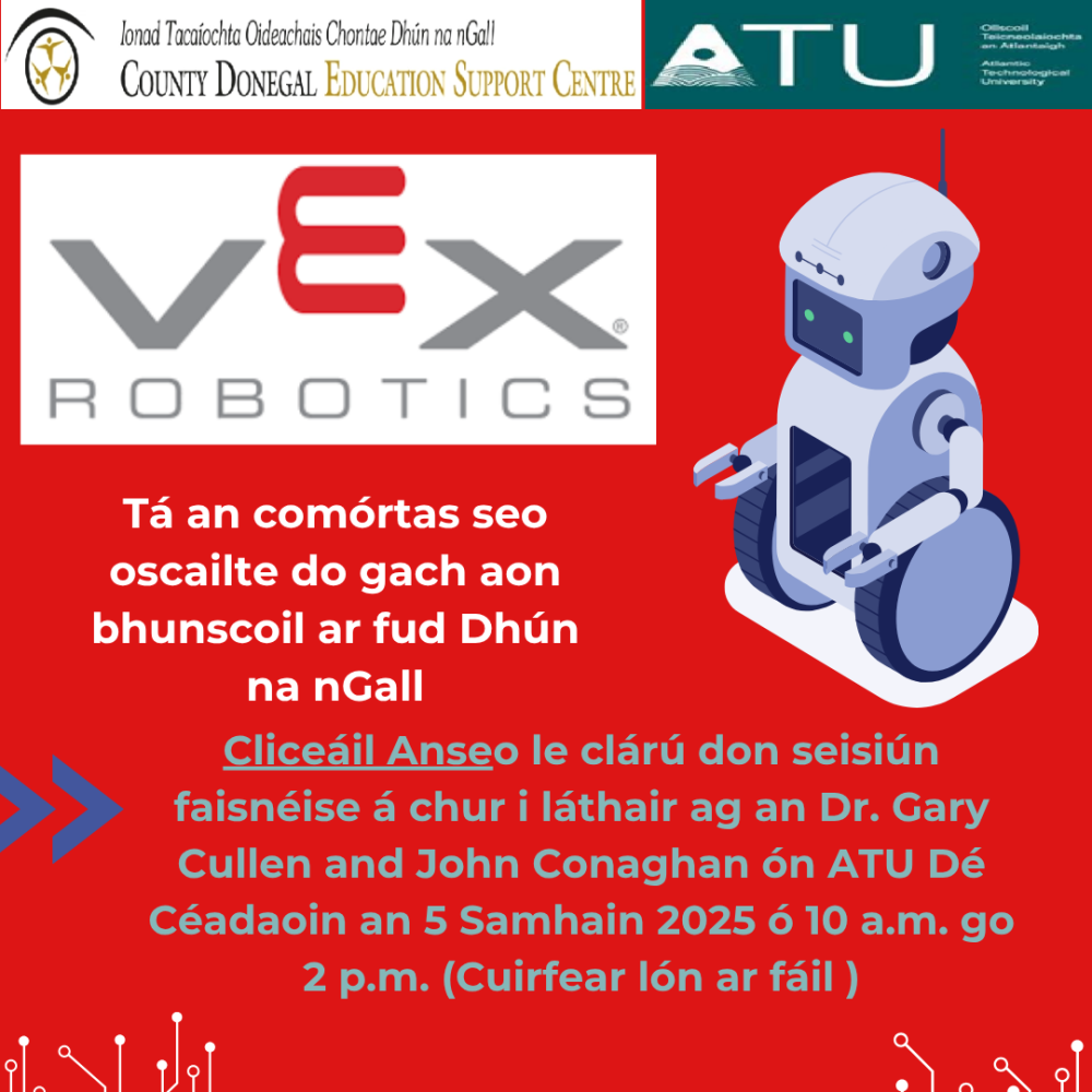 • Buntreoir do Róbataic VEX (Bunscoileanna) - chun cabhrú le scoileanna ar spéis leo iad a ullmhú, thairg an Dr Gary Cullen agus John Conaghan ó ATU Leitir Ceanainn seisiún eolais a chur ar fáil in Ionad Tacaíochta Oideachais Dhún na nGall Dé Céadaoin an 5 Samhain 2025 ó 10 a.m. go 2 p.m. (cuirfear lón ar fáil), cliceáil anseo chun tuilleadh eolas a fháil.
