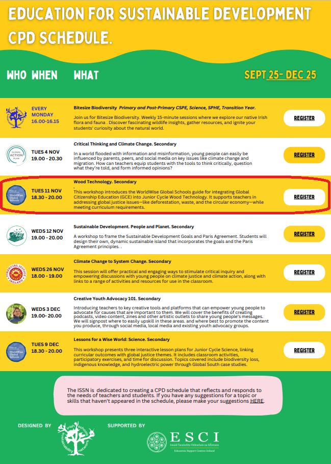 This workshop introduces the WorldWise Global Schools guide to Doing Global Citizenship Education in Junior Cycle Wood Technology. The guide supports teachers of Wood Technology to teach through a global justice lens, while also meeting the requirements of the Wood Technology specification. This workshop presents Wood Technology topics and learning outcomes which link with global justice issues, including deforestation, the circular economy, waste, and more. In the workshop we will outline the lessons and accompanying PowerPoints from the guide itself, we will go through the global citizenship education teaching methods in the guide, and highlight cross-curricular links.