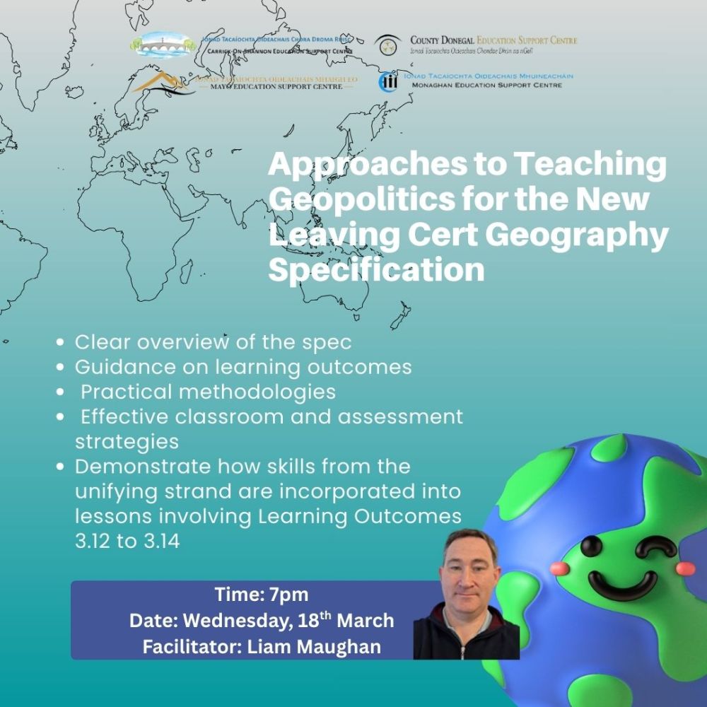 This webinar will provide an insightful session on teaching Geopolitics in the new Leaving Certificate Geography specification. The main focus of the webinar will be practical approaches to planning for and teaching Learning Outcomes 3.12, 3.13 and 3.14 of Strand 3 – The Global Environment.