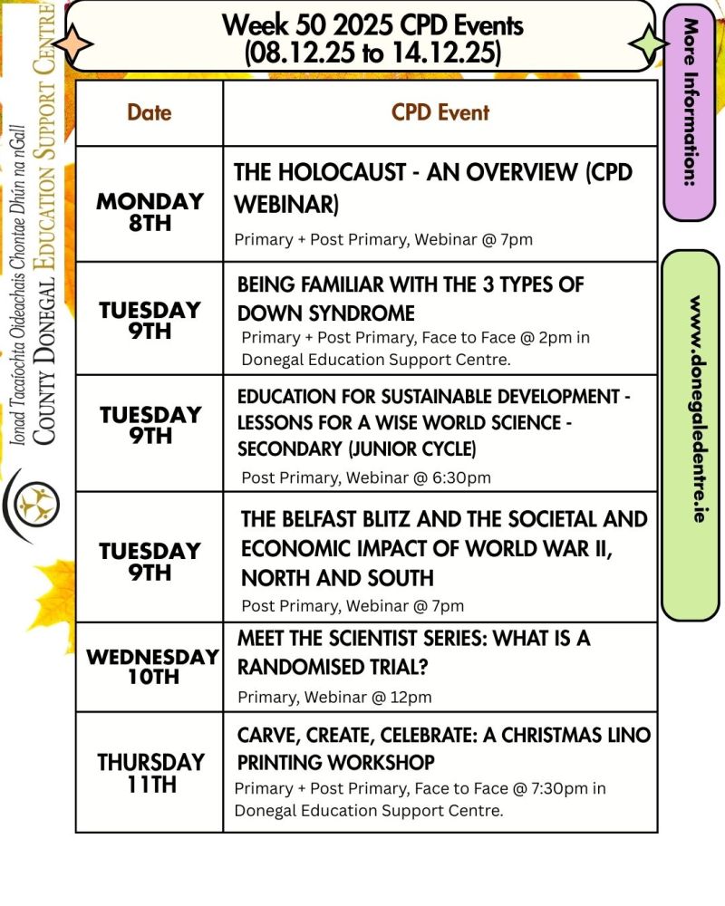 You can also review all of these CPD events in either the Primary or Post Primary courses section of the centre website.