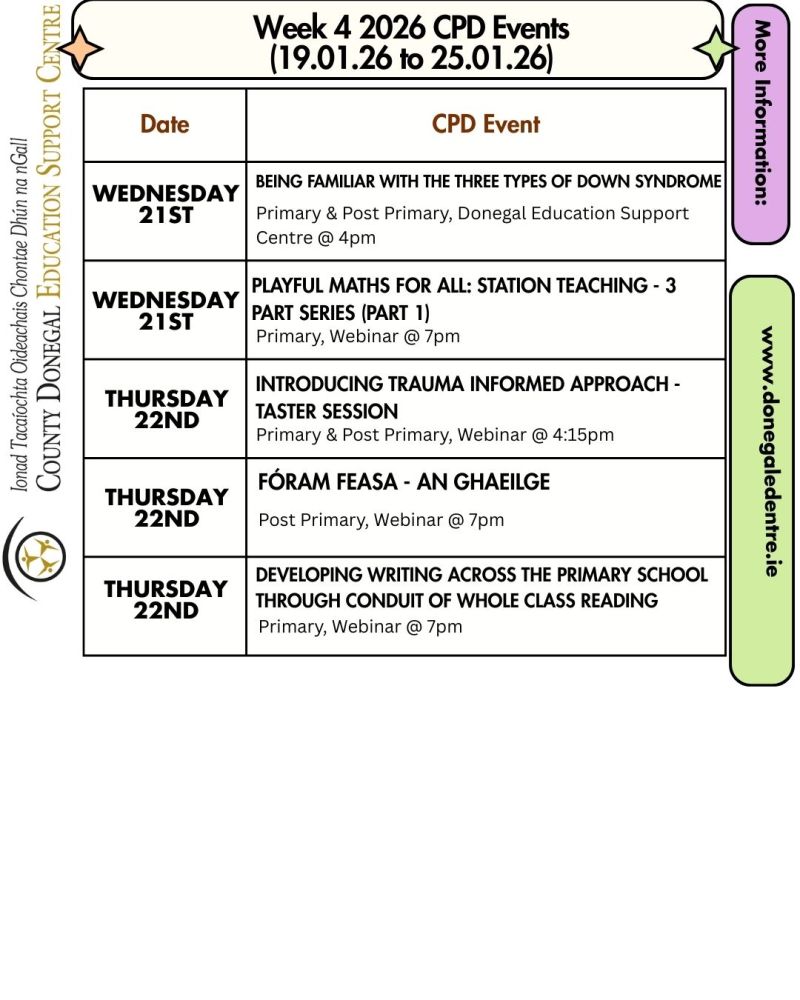You can also review all of these CPD events in either the Primary or Post Primary courses section of the centre website.