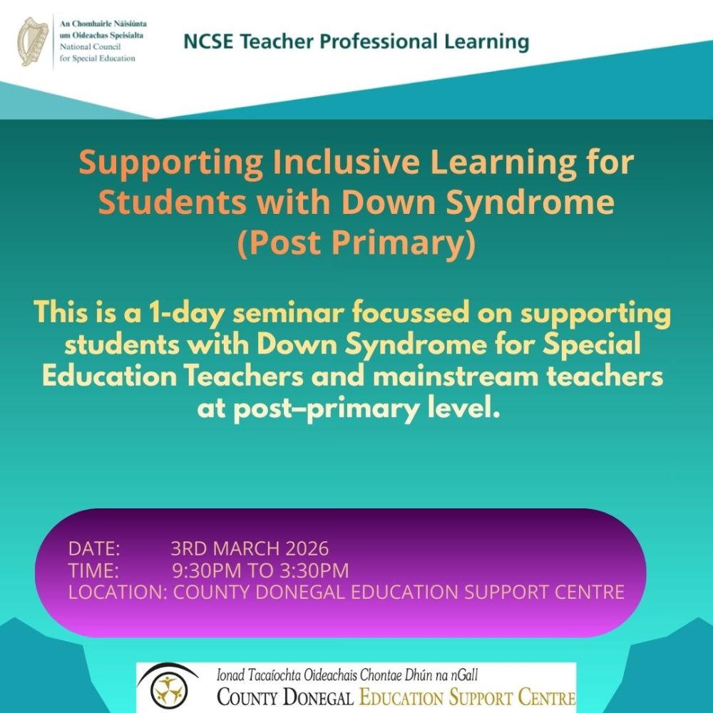 This is a 1-day seminar focussed on supporting students with Down Syndrome for Special Education Teachers and mainstream teachers at post–primary level.