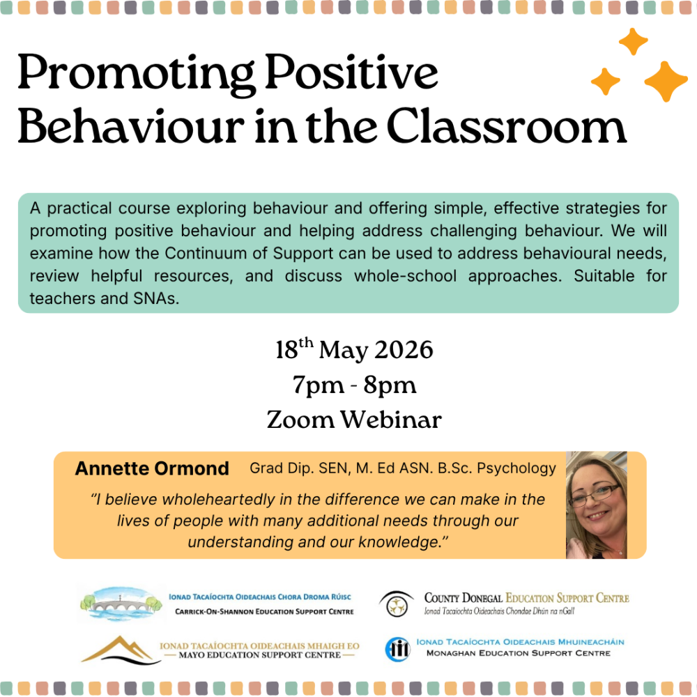 We will examine how the Continuum of Support can be used to address behavioural needs, review helpful resources, and discuss whole-school approaches. Suitable for teachers and SNAs.