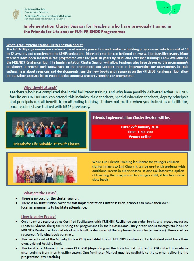 The National Educational Psychological Service (NEPS), with support from our colleagues in the Galway Education Support Centre, are holding an online implementation cluster session for teachers who have previously completed training or delivered either the Friends for Life Programme and/or the Fun Friends Programme.