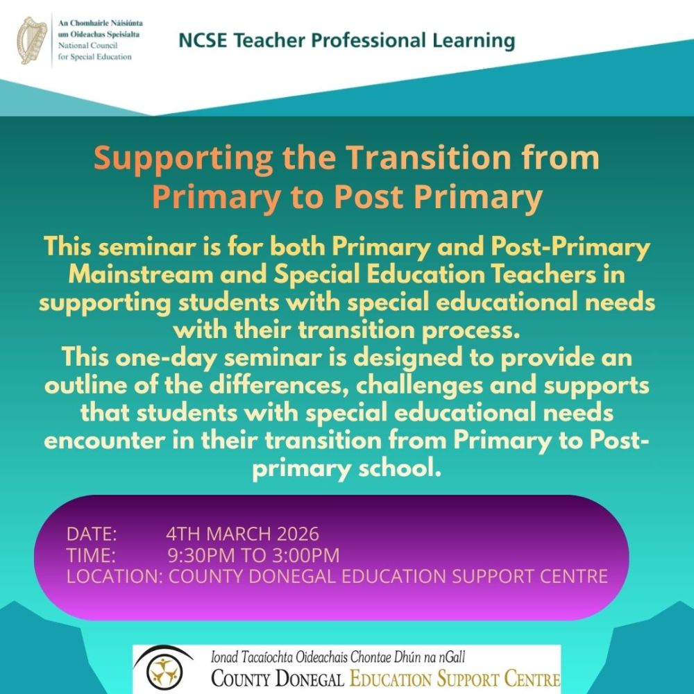 This seminar is for both Primary and Post-Primary Mainstream and Special Education Teachers in supporting students with special educational needs with their transition process.
