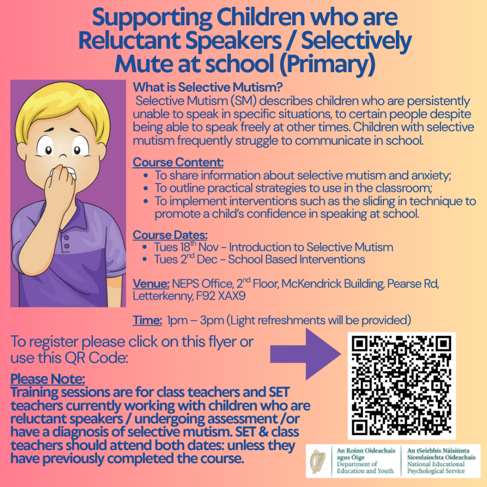 NEPS have shared the following information about a series of upcoming training sessions focused on supporting children who are reluctant speakers / selectively mute at school - further details in flyer below.